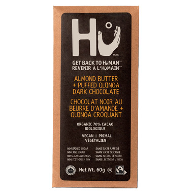 HU Almond Butter and Puffed Quinoa Dark Chocolate with Organic 70% Cacao.