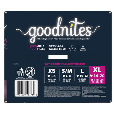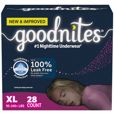 - Goodnites Girls' Nighttime Bedwetting Underwear: 28 overnight underwear for girls, size extra large; fits children 95-140+ lbs