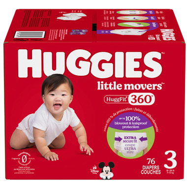 Huggies Little Movers HuggFit 360 Baby Diapers have 360 protection to help prevent leaks from any angle and an extra secure waistband designed to move with baby during play. HuggFit 360 slip-on diapers also provide an extra secure fit for up to 100% blowout and leakproof protection. Our diaper pants have 4X Advanced Leak Blockers that are thicker, curvier, more elastic, and have softer leg guards* (*vs. Pampers Cruisers 360). HuggFit 360 diapers are also made without parabens, phthalates, lotions, elemental chlorine and natural rubber latex. They also provide more butt coverage* (*vs Pampers Cruisers 360). A wetness indicator built into the pull-on diaper baby diaper can let you know in a timely fashion when it is time for a change.