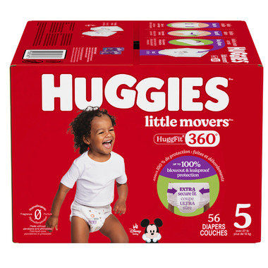Huggies Little Movers HuggFit 360 Baby Diapers have 360 protection to help prevent leaks from any angle and an extra secure waistband designed to move with baby during play. HuggFit 360 slip-on diapers also provide an extra secure fit for up to 100% blowout and leakproof protection. Our diaper pants have 4X Advanced Leak Blockers that are thicker, curvier, more elastic, and have softer leg guards* (*vs. Pampers Cruisers 360). HuggFit 360 diapers are also made without parabens, phthalates, lotions, elemental chlorine and natural rubber latex. They also provide more butt coverage* (*vs Pampers Cruisers 360). A wetness indicator built into the pull-on diaper baby diaper can let you know in a timely fashion when it is time for a change.