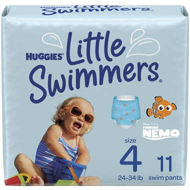 Enjoy worry-free water fun and let your baby make a splash in Huggies Little Swimmers swim diapers! Made with unique materials that won't swell in water like regular baby diapers, Little Swimmers give your baby a comfortable fit when wet or dry. For secure protection in the water, Little Swimmers are designed with Double Leak Guards that fit snugly around your baby's legs to help contain messes. Made to fit like swimwear, these Huggies diapers for swimming feature easy open, refastenable sides for an adjustable fit and quick diaper changes, whether you're at the pool or on the beach. Plus, the soft, stretchy waistband make these swim pants comfortable for your baby. These swimming diapers are also made with no harsh ingredients and are free of fragrances, lotions, elemental chlorine bleaching and natural rubber latex. Each pack features two Disney·Pixar Finding Nemo designs your child will love. Perfect for the pool, beach, splash park and more! Huggies Little Swimmers are available in sizes 3 Small (16-26 lbs), 4 Medium (24-34 lbs) and 5-6 Large (32+ lbs).