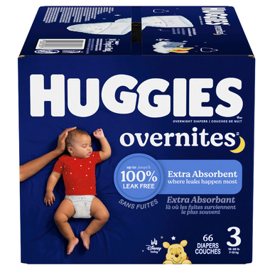 Say goodnight to midnight changes with Huggies Overnites Baby Diapers! As the #1 Selling Night-Time Diaper*, Overnites night diapers feature a DryTouch Liner with extra absorbency that locks away moisture for up to 12 hours of overnight protection to help keep your baby's skin dry as they sleep. With a contoured shape for trusted leak protection and a pocketed waistband to help prevent blowouts, Huggies Overnites provides all-night protection and comfort so your baby can have drier nights and better mornings**. These disposable overnight diapers also feature Huggies' SnugFit Waistband with Double Grip Strips for a secure fit, perfect for babies starting to roll and toss during sleep. They also are designed to help provide red-mark free protection around your babys legs and have pillowy soft leg cuffs. Plus, a breathable outer cover helps keep your baby's skin dry and comfortable, while Huggies' wetness indicator lets you know if your little one needs a diaper change.