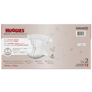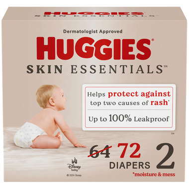 Additionally, Skin Essentials diapers feature a wetness indicator that changes color when wet to alert you when the diaper needs to be changed. Huggies Skin Essentials diapers, wipes, and Pull-Ups training pants give you everything you want for your child's skin and nothing you don't. They're dermatologist approved and designed to help keep skin clean and healthy from baby to BIG KID. These baby diapers feature Disney patterns as cute as you, baby!