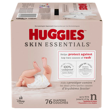 Your baby’s skin health is essential to their overall health and comfort, and Huggies Skin Essentials Baby Diapers want to help you make it a priority. Made with a SkinProtect Liner that helps lock away moisture and runny mess, Skin Essentials infant diapers help protect against the top two causes of rash.* Clinically tested safe for sensitive skin, Huggies Skin Essential newborn diapers are hypoallergenic and free of fragrance. These infant diapers are made without phthalates, parabens, elemental chorine, lotions & latex* (*natural rubber). Extremely soft for your baby’s comfort, Skin Essentials newborn diapers feature a soft, breathable outer cover and is up to 100% leak free. Additionally, Skin Essentials diapers feature a wetness indicator that changes color when wet to alert you when the diaper needs to be changed. Huggies Skin Essentials diapers, wipes, and Pull-Ups training pants give you everything you want for your child's skin and nothing you don't. They’re dermatologist approved and designed to help keep skin clean and healthy from baby to BIG KID.