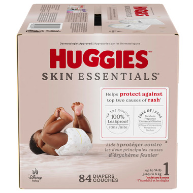 Your baby’s skin health is essential to their overall health and comfort, and Huggies Skin Essentials Baby Diapers want to help you make it a priority. Made with a SkinProtect Liner that helps lock away moisture and runny mess, Skin Essentials infant diapers help protect against the top two causes of rash.* Clinically tested safe for sensitive skin, Huggies Skin Essential newborn diapers are hypoallergenic and free of fragrance. These infant diapers are made without phthalates, parabens, elemental chorine, lotions & latex* (*natural rubber). Extremely soft for your baby’s comfort, Skin Essentials newborn diapers feature a soft, breathable outer cover and is up to 100% leak free. Additionally, Skin Essentials diapers feature a wetness indicator that changes color when wet to alert you when the diaper needs to be changed. Huggies Skin Essentials diapers, wipes, and Pull-Ups training pants give you everything you want for your child's skin and nothing you don't. They’re dermatologist approved and designed to help keep skin clean and healthy from baby to BIG KID.