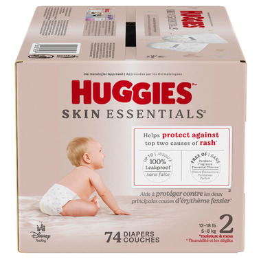 Your baby’s skin health is essential to their overall health and comfort, and Huggies Skin Essentials Baby Diapers want to help you make it a priority. Made with a SkinProtect Liner that helps lock away moisture and runny mess, Skin Essentials infant diapers help protect against the top two causes of rash.* Clinically tested safe for sensitive skin, Huggies Skin Essential newborn diapers are hypoallergenic and free of fragrance. These infant diapers are made without phthalates, parabens, elemental chorine, lotions & latex* (*natural rubber). Extremely soft for your baby’s comfort, Skin Essentials newborn diapers feature a soft, breathable outer cover and is up to 100% leak free. Additionally, Skin Essentials diapers feature a wetness indicator that changes color when wet to alert you when the diaper needs to be changed. Huggies Skin Essentials diapers, wipes, and Pull-Ups training pants give you everything you want for your child's skin and nothing you don't. They’re dermatologist approved and designed to help keep skin clean and healthy from baby to BIG KID.