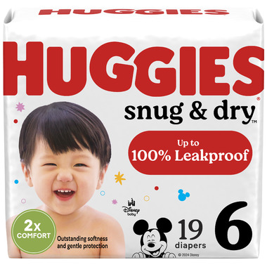 Huggies Snug & Dry Baby Diapers features Huggies' Leak Lock Protection, giving your baby up to 12 hours of long-lasting protection, day or night. Snug & Dry absorbs wetness in seconds, thanks to Huggies' Triple Layer Protection. Snug & Dry baby diapers have a soft, stretchy waistband for added comfort and curves at every layer to fit your babys delicate skin. They also come with a wetness indicator that changes from yellow to blue when your baby is ready for a diaper change. Snug & Dry disposable diapers are hypoallergenic, as well as free of fragrances, lotions, parabens, elemental chlorine and natural rubber latex.