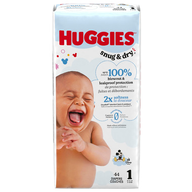 The Snug & Dry diapers are designed with 2x softness: CloudSoft absorbent layers and waistband and a curved and stretchy fit. Softer than the leading premium diaper, more parents choose Huggies Snug & Dry infant diapers as softer.* With Snug & Dry baby diapers, you can bring up to 100% leak and blowout protection to your diapering routine. Made with the original Leak Lock blowout blocker, Snug & Dry baby diapers help provide up to 100% leak proof and blowout protection. Additionally, these diapers are designed with a curved and stretchy fit and outstanding leakage protection. As the only leading brand that is entirely fragrance free,* Snug & Dry newborn diapers are free of fragrances and elemental chlorine. They are also made without lotions and natural rubber latex. To better alert you when a diaper change is needed, the wetness indicator on Snug & Dry infant diapers changes color when wet.