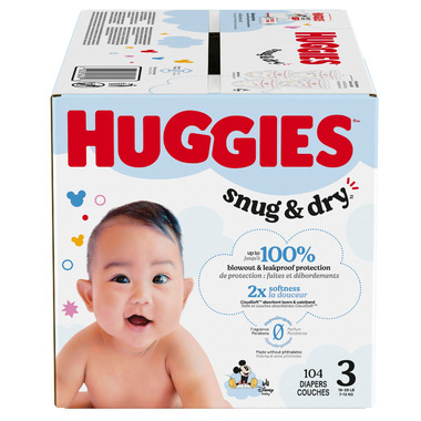 The Snug & Dry diapers are designed with 2x softness: CloudSoft absorbent layers and waistband and a curved and stretchy fit. Softer than the leading premium diaper, more parents choose Huggies Snug & Dry infant diapers as softer.* With Snug & Dry baby diapers, you can bring up to 100% leak and blowout protection to your diapering routine. Made with the original Leak Lock blowout blocker, Snug & Dry baby diapers help provide up to 100% leak proof and blowout protection. Additionally, these diapers are designed with a curved and stretchy fit and outstanding leakage protection. As the only leading brand that is entirely fragrance free,* Snug & Dry newborn diapers are free of fragrances and elemental chlorine. They are also made without lotions and natural rubber latex. To better alert you when a diaper change is needed, the wetness indicator on Snug & Dry infant diapers changes color when wet.