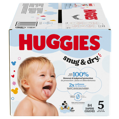 The Snug & Dry diapers are designed with 2x softness: CloudSoft absorbent layers and waistband and a curved and stretchy fit. Softer than the leading premium diaper, more parents choose Huggies Snug & Dry infant diapers as softer.* With Snug & Dry baby diapers, you can bring up to 100% leak and blowout protection to your diapering routine. Made with the original Leak Lock blowout blocker, Snug & Dry baby diapers help provide up to 100% leak proof and blowout protection. Additionally, these diapers are designed with a curved and stretchy fit and outstanding leakage protection. As the only leading brand that is entirely fragrance free,* Snug & Dry newborn diapers are free of fragrances and elemental chlorine. They are also made without lotions and natural rubber latex. To better alert you when a diaper change is needed, the wetness indicator on Snug & Dry infant diapers changes color when wet.