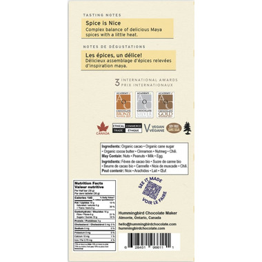 Cacao, Organic cane sugar, Organic cocoa butter, Chili, Cinnamon, Nutmeg.
