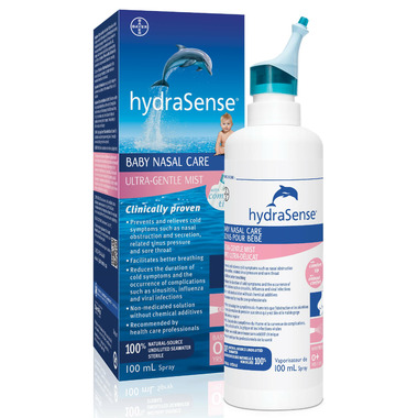 hydraSense Ultra-Gentle Mist with comfort tip specially designed to relieve nasal congestion in babies for use in the nostrils of young babies. Try this product if your baby is having trouble breathing because of dry or obstructed nasal passages due to a cold or nasal congestion.  hydraSense Ultra-Gentle mist is available in 100 mL and 210 mL sizes. Directions for use: For each use, press on the applicator for 1-2 seconds to apply hydraSense Ultra-Gentle Mist. Use at least twice a day (morning and evening), or 4 to 6 times a day when cold or allergy symptoms are present. hydraSense Baby Nasal Care products are an effective, easy-to-use method of comfortably cleansing nasal cavities and facilitating nose blowing.  Products containing liquid are made of 100% natural-source, sterile, undiluted seawater solution that is exclusively sourced from the Bay of Saint-Malo in France - renowned for its strong currents, providing oxygenation and a wealth of naturally occurring mineral salts and trace elements.  The manufacturing process desalinates seawater to an optimum level to preserve the cleansing effects of seawater.  hydraSense Baby Nasal Care products are non-medicated, contain no preservatives and can be used several times daily to cleanse nasal cavities.