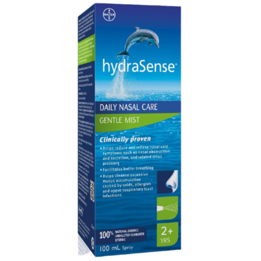 hydraSense Gentle Mist nasal spray is designed for sensitive noses and first-time users who are experiencing nasal symptoms of allergies (seasonal or year-round) or a cold. It can also be used to hydrate and cleanse dry nasal passages. It is clinically proven to help reduce and relieve nasal cold symptoms and helps relieve nasal obstruction and secretion and related sinus pressure. hydraSense Gentle Mist is made with 100% natural-sourced undiluted seawater and is available in 100 mL and 210 mL sizes.