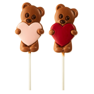 Adorable milk chocolate bear pops made with luxurious Belgian chocolate. Individually wrapped in cello, these pink and red hearts are perfect for Valentine's Day and beyond!