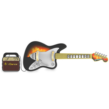 This electric guitar features 6 strings, 8 fretboard buttons (and decorative stickers), and disco LED effects!