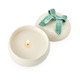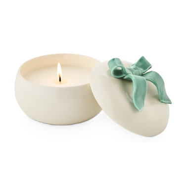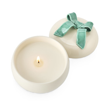 Coconut Milk Mango 6.7oz Bow Lidded Ceramic Candle. An ode to innocence, with all things sweet and playful. Bows, baubles, repeat.Balsamic sandalwood + Muddled summer fruit + Sun-ripened mandarin