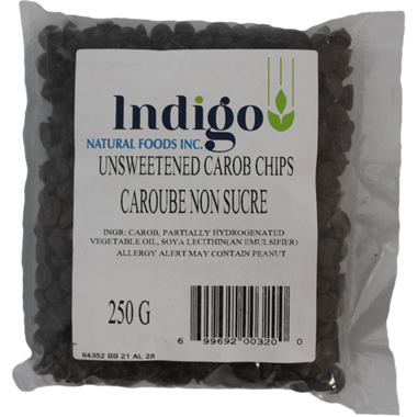 Indigo Carob Chips Unsweetened in a 250g packet.