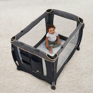 The play yard also includes the Dream Centre™, a perfect place for newborns to rest or play thanks to soft fabrics, breathable mesh and a toy bar with two adorable toys; the Just Right Height™ elevated changing table, making diaper changes more comfortable for both you and baby, and it flips easily out of the way when not in use. Side storage pockets help keep you organized and all baby's needs within reach. For quick pack up, the OneLessStep™ feature means this play yard folds fast (without removing the bassinet) to make transport easier on you.