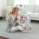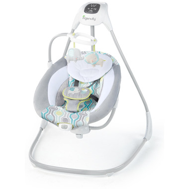 Ingenuity™ especially designed the SimpleComfort Cradling Swing™ to make mom’s day more simple and convenient, without breaking the bank! This innovative oversized seat with adjustable recline rotates 180 degrees to keep baby in better view of mom, and baby can swing in not 1, not 2, but 3 directions! The super lightweight frame has wheels and a convenient easy-to-pull handle which make it simple to move this full-size swing from room to room. Moms, you never have to spend money on batteries with the included AC adaptor. From the GentleTouch™ control panel, customize baby’s experience with soothing vibration, 8 melodies, 3 nature sounds and white noise. Get a few hands-free moments with a swing timer that can be set to 30, 45, or 60 minutes. TrueSpeed™ technology maintains 6 consistent speeds-even as baby grows. WhisperQuiet™ technology allows baby to swing in silence. The mobile is adorned with 2 adorable plush characters for baby to engage with while they are cradled in soft fabrics. When things get a little messy, the seat pad can be removed and tossed in the washing machine. The tasteful fashion is sure to compliment the décor of any home and is perfect for a girl or boy.