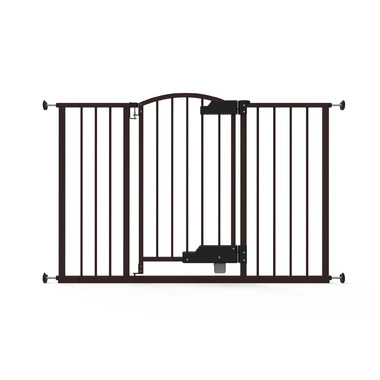 - Finished with modern espresso metal, steel design & decorative arched doorway allow you to childproof your home in style; designed by leading gate innovation brand
