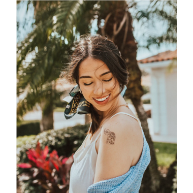 Directions: Make sure application area is clean and dry. Peel off plastic top sheet, place tattoo face down on your skin, and wet the back of tattoo paper until completely soaked through with water. Press and hold for a few seconds, then gently peel off paper to reveal your inked.