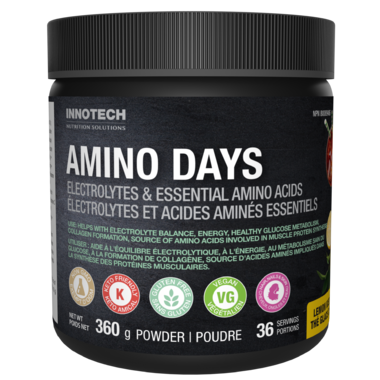 Amino Days is expertly formulated by Reginald Friesen M.D. and Innotech Nutrition to provide a balanced blend of essential amino acids, electrolytes, vitamins, and minerals. It is low in calories, non-GMO, non-dairy, and free of sugar, MSG, artificial sweeteners, artificial flavors, and colors. This product supports your body’s natural ability during times of increased demand for key nutrients. Naturally sweetened with premium quality stevia leaf.