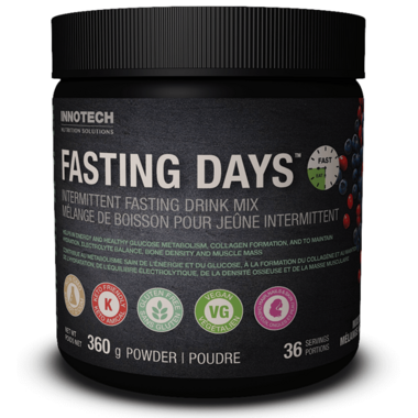 Fasting Days is formulated by Reginald Friesen M.D.and Innotech Nutrition to help support Intermittent Fasting with a balanced nutrient fortified powder mix that is mixed into water. It is low in calories, non-GMO, non-dairy and free of sugar, gluten, MSG, artificial sweeteners, artificial flavors and colors. With 10 grams of amino acids, 13 vitamins and minerals including your daily electrolyte requirement, this product helps support the body's natural ability during your fasting hours. Sweetened with premium quality stevia leaf.