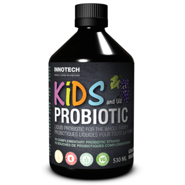 KIDS and Us Family Probiotic includes: Lactobacillus acidophilus, L. casei, L. rhamnosus, Bifidobacterium animalis, B. lactis, B. longum, Lactococcus lactis subsp. lactis, Lactococcus lactis subsp. lactis biovar diacetylactis, Leuconostoc pseudomesenteroides, Streptococcus thermophilus, Distilled Water, Organic Black Strap Molasses, Active Cultures, Herbal Tea (Aniseed, Liquorice root, Fennel, Basil, Chervil, Dill, Fenugreek, Ginger root, Juniper leaf, Nettle, Oregano, Parsley, Peppermint, Rosemary, Thyme, Beet root, Angelica, Elder, Chamomile, Sage) Natural Flavour, Grape Juice Powder, Stevia Leaf Extract.