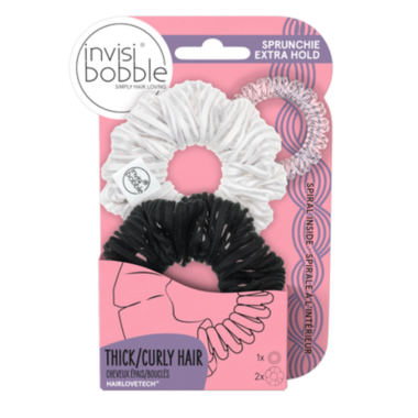 The extra hold sprunchies for thick and curly hair include 1 grey and 1 black sprunchie.