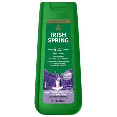 Feel invigorated every day with Irish Spring 5 in 1 Moisturizing Body Wash for Men in Fresh Eucalyptus & Bergamot Scent. Simplify your grooming routine with this men’s body wash that works as your shampoo, conditioner, face wash, body wash, and 24 hour deodorizer.