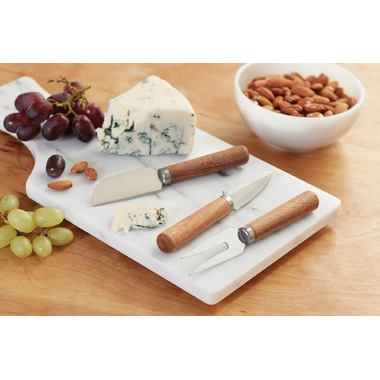 Elegant acacia wood and stainless steel cheese knives. Cheese knife, slicer and spreaders enables you to easily handle and slice all types of cheese--hard and soft--parmesan, swiss, brie, ball, asiago, cheddar, feta, parmigiano, monterey jack, gouda, goat, and more. Sure to be a hit at your next wine and cheese party. Great compliment to cheese boards, wire slicers, fondue and serving sets, and other gourmet gadgets.