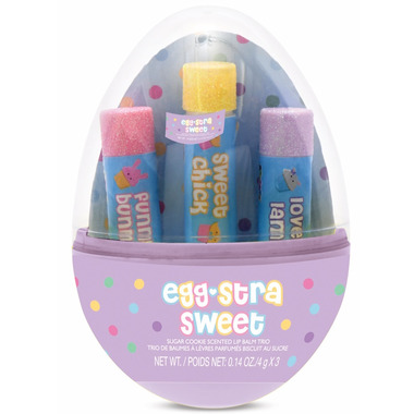 Every girl can use an extra special lip balm on hand for some extra moisture and protection when she needs it! Add a glittery cap and a fun scent and she'll be ready for anything that comes her way! This lovely lip balm set features three vanilla sugar cookie scented balms with three different container designs that are as cute as can be. The scented balms will leave her lips soft and protected from wind and other drying elements! Balm set is beautifully packaged in a sweet egg shaped package, perfect for giving! Balm containers measure approximately 1.75" high.