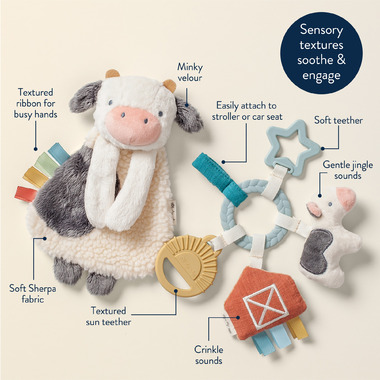 Love is in the details with the Bitzy Busy Gift Set! Featuring the Itzy Loveyٙ and Bitzy Busy Ring, this gift set is a sensory sensation. Snuggle in close with the soft Itzy Loveyٙ. Easily attach the Bitzy Busy Ring to a car seat or stroller for adventures ahead! The textured teethers and dangling toys that jingle & crinkle are sure to delight!