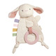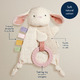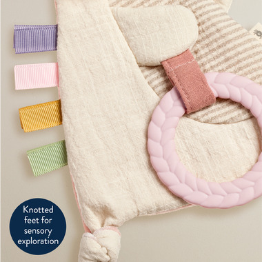 Soft natural cotton fabric, Crinkle sound and textured ribbons entertain, Braided teething ring soothes sore gums, Ribbons entertain baby with movement and textures.