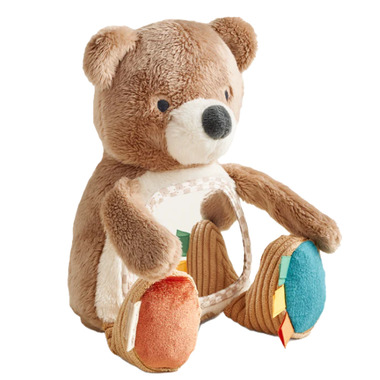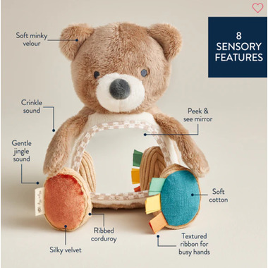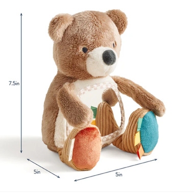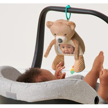 Theo the Bear! Objects in the Itzy Bitzy Mirror are cuter than they appear! Watch as your babe smiles at their reflection in the mirror, reaches for the textured feet, and grasps for the ribbons. Attach to your car seat for on-the-go entertainment and sensory play. Tummy time never looked better!