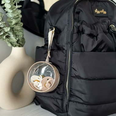 The clear winner in paci storage! The multi-use Itzy Paci Case attaches onto your diaper bag, purse, or travel bag to keep essential parenting items in clear view. Just snap the case to your diaper bag and go! Clear material shows off your adorable Itzy Ritzy pacifiers and keeps them clean inside your bag.