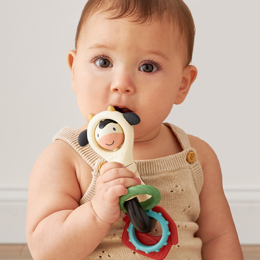 A sensory sensation for your little one! The Itzy Spinner is a sensory toy and teether all-in-one. Gentle rattle sounds and a spinning face are sure to captivate. The easy-grip handle turns and clicks keeping tiny hands busy. Soft ears and three clinking rings are textured to provide relief to sore gums. An all-purpose companion for your little adventurer!