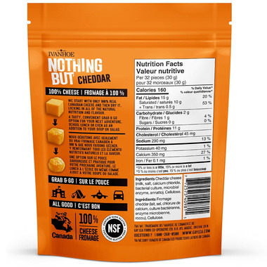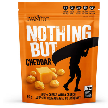 Ivanhoe Nothing but Cheddar made with 100% cheese with a crunch. Ivanhoe start with only 100% real Canadian cheese and then dry it; locking in all the natural nutrition and flavour. A tasty, convenient grab and go option for your next adventure, school lunch or even as an addition to your soup or salad.