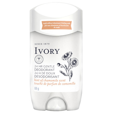 Ivory Gentle Deodorant, with a hint of chamomile fragrance, is made with naturally derived Dead Sea salt for 24-hour odor protection that is designed to be gentler on your skin.