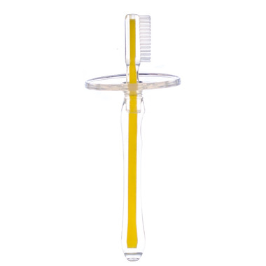 Before use, attach safety shield to toothbrush. Pass the toothbrush head through the center hole on shield (you'll need to stretch it). The shield rests just below the bristles. Wash your hands! Rinse toothbrush thoroughly before and after each use, especially the bristles. Periodically, sterilize in boiling water. Apply a small amount of Jack N' Jill Natural Toothpaste to bristles and brush teeth with a gentle, circular motion.
