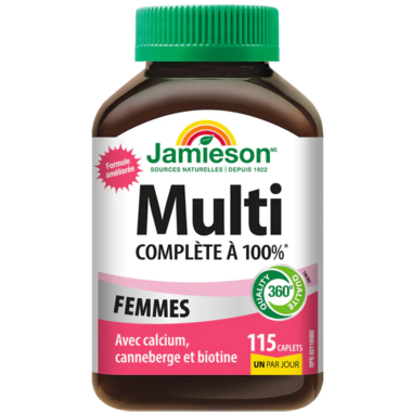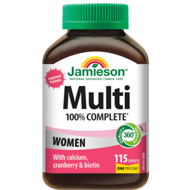 Jamieson 100% Complete Multivitamin for Women is the easy way to get 100% of your body's daily vitamin needs. It is formulated to Health Canada's recommendations so you can feel confident you are getting 100% or more of the vitamins your body needs each day!