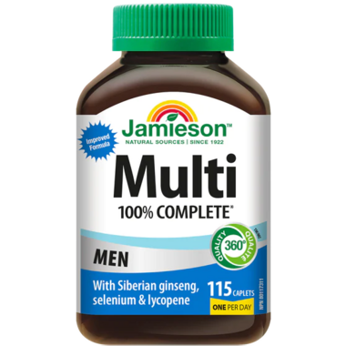 Jamieson 100% Complete Multivitamin for Men is the easy way to get 100% of your body's daily vitamin needs. It is formulated to Health Canada's recommendations so you can feel confident you are getting 100% or more of the vitamins your body needs each day!