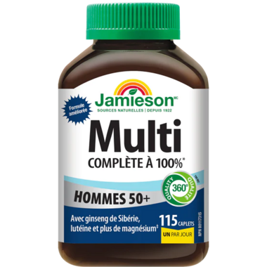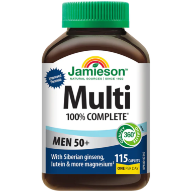 Jamieson 100% Complete Multivitamin for Men 50+ is the easy way to get 100% of your body's daily vitamin needs. It is formulated to Health Canada's recommendations so you can feel confident you are getting 100% or more of the vitamins your body needs each day!