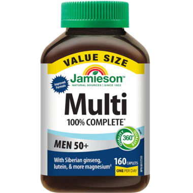 Jamieson 100% Complete Multivitamin for Men 50+ is the easy way to get 100% of your body's daily vitamin needs. It is formulated to Health Canada's recommendations so you can feel confident you are getting 100% or more of the vitamins your body needs each day!
