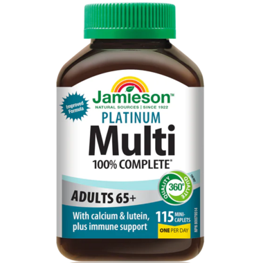 Jamieson Platinum Multivitamin has been specially formulated to meet the needs of Canadians 65 years old and better! The easy to swallow mini caplet is vitamin K and iron free, and comes in an easy to open bottle.