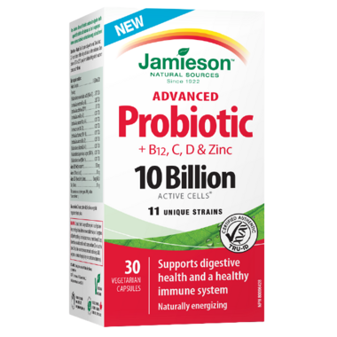 Jamieson Advanced Probiotic plus B12, C, D and Zinc is a daily formula that provides a unique blend of Probiotics, Vitamins B12, C, D and Zinc to provide support for the maintenance of digestive health, immunity and natural energy. One vegetarian capsule delivers 10 Billion CFU of probiotics, 600 IU of vitamin D from lichen, 10 mg of vitamin C, 250 mcg of vitamin B12, and 11 mg of zinc.