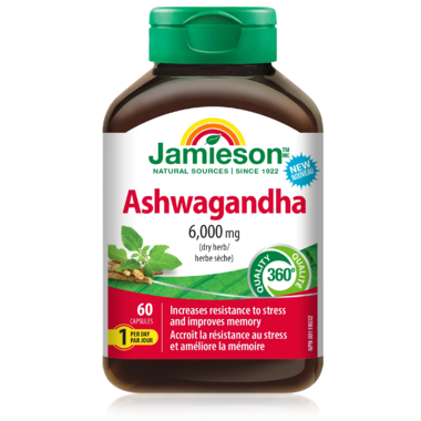 Jamieson Ashwagandha Capsules are the easy way to support your response to stress and increase energy. A Non-GMO, vegetarian friendly formula that contains 6,000 mg of dried Ashwagandha per capsule.