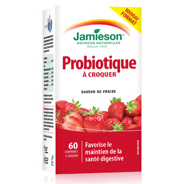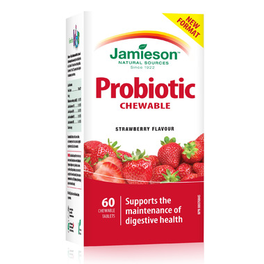 Jamieson Chewable Probiotic is a delicious strawberry flavoured tablet that supports the maintenance of digestive health and is suitable for both adults and children 3+. Each chewable tablet contains 2 billion active cells and five unique strains. Jamieson's advanced tube technology packaging protects each probiotic tablet from heat and moisture to guarantee potency to expiration.