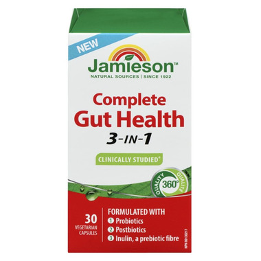 Jamieson's Complete Gut Health is a unique 3 in 1 solution for digestive health; containing a clinically studied Postbiotic, Probiotics, and Inulin, a prebiotic fiber. Along with digestive support, Jamieson's Complete Gut Health supports the immune system by reducing the incidence of cold and flu symptoms in the winter months.