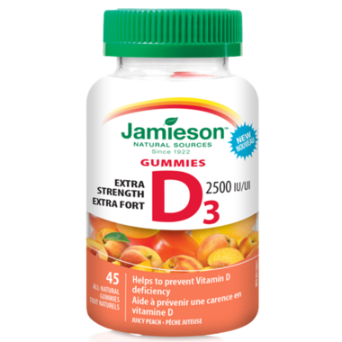 Jamieson's Extra Strength Vitamin D3 Gummies are great tasting and deliver 2,500 IU of pure, naturally sourced vitamin D3 to help prevent vitamin D deficiency. This extra strength formula is great way to boost your intake of Vitamin D with a higher potency dose in a convenient single serving.